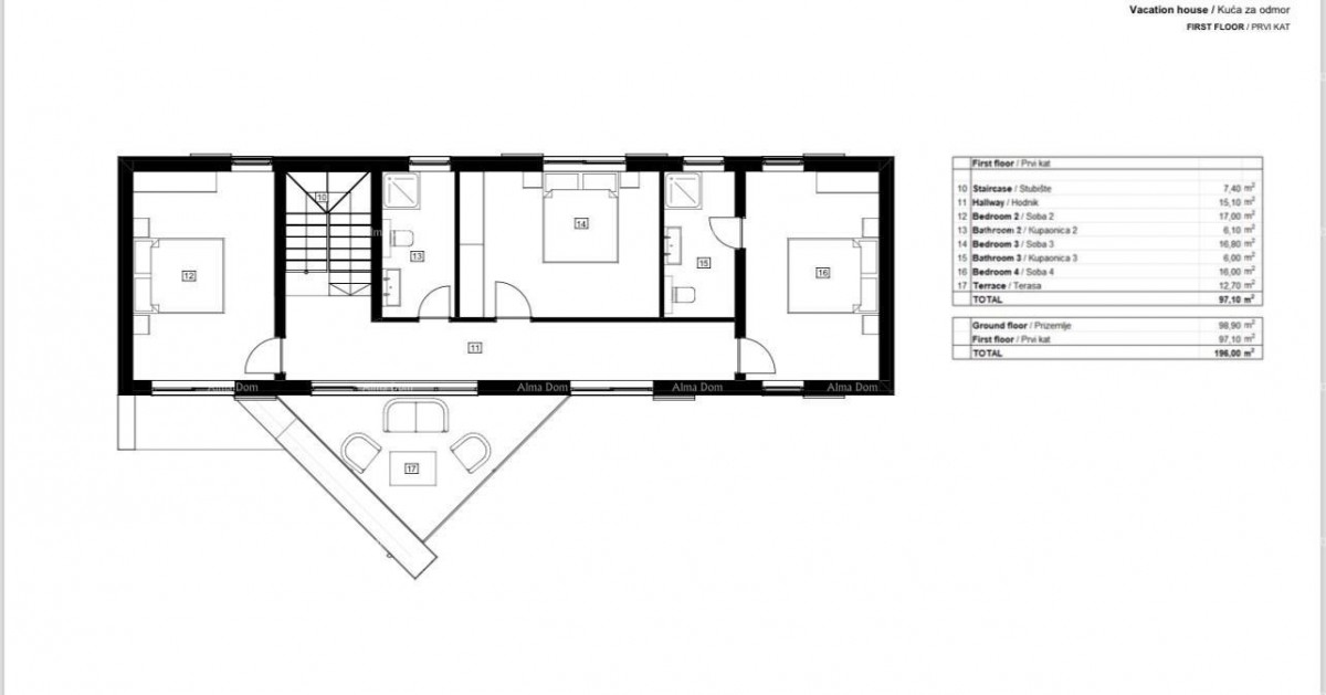 De eerste verdieping is bereikbaar via een trap die leidt naar een lichte hal, die drie extra ruime slaapkamers met elkaar verbindt. Eén slaapkamer heeft een eigen en-suite badkamer, terwijl de andere twee slaapkamers een extra badkamer delen. Ook is er een prachtig terras op deze verdieping – ideaal om van een kopje koffie in de ochtend of zonsondergang in de avond te genieten, met panoramisch uitzicht.